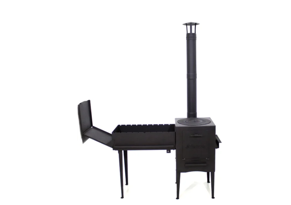 Комплект поставки решетка, печь под казан, золосборник, ручки (2 шт. по бокам, 1 шт. на дверце), дверца, дымоход, ножки, жаровня, труба, крышка-столик