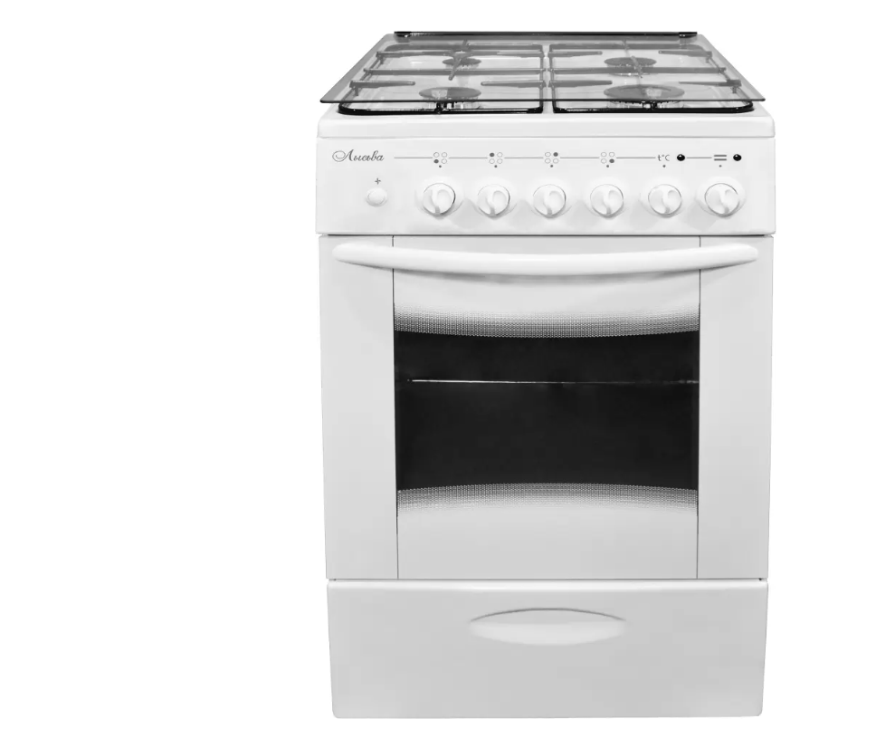 газовая панель + электрический духовой шкаф, газ-контроль конфорок, поверхность: эмалированная сталь, крышка из закалённого стекла, управление механическое, без таймера, размеры (ШхГхВ): 50x60x85 см, цвет белый