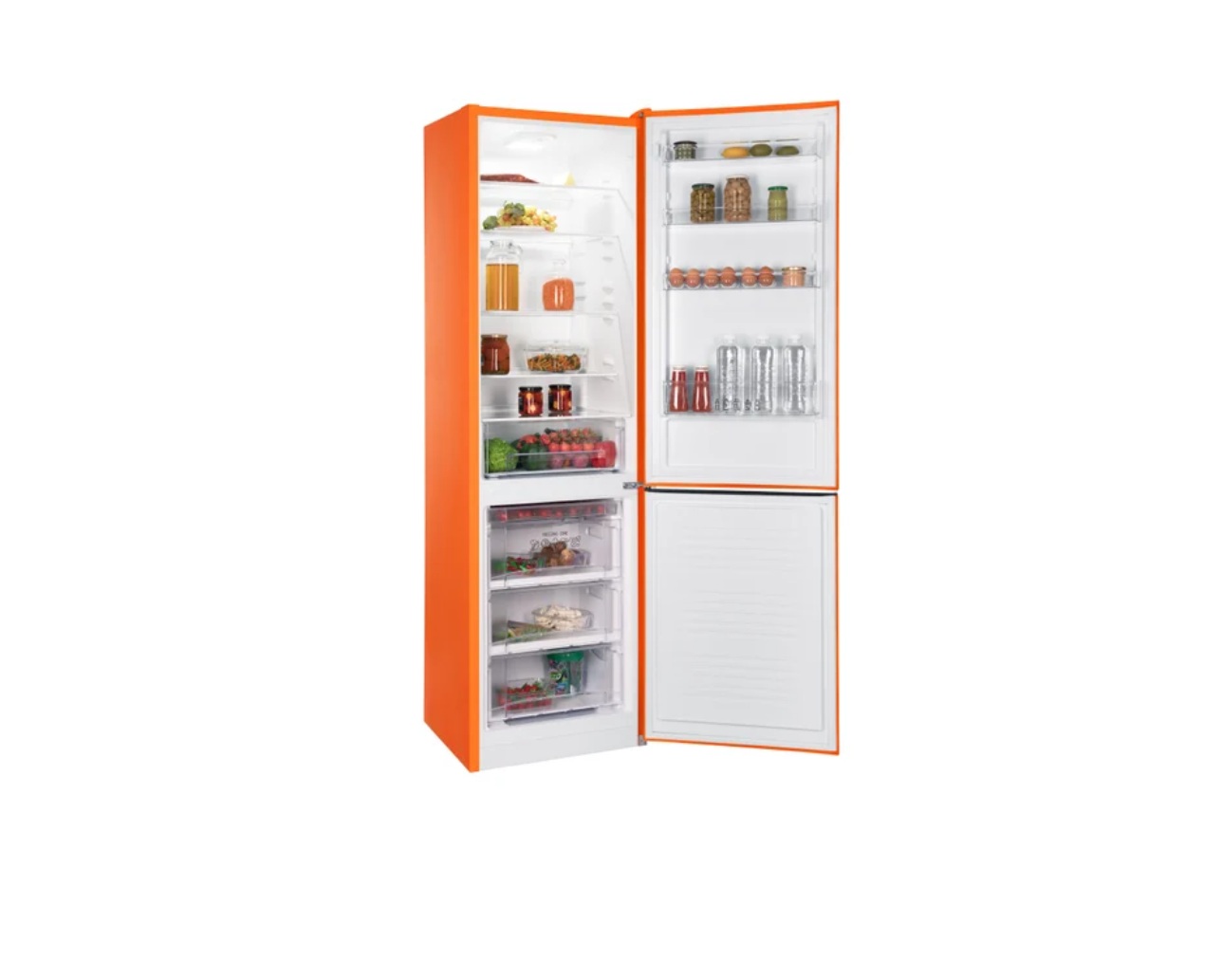 отдельностоящий, No Frost (морозильная камера), механическое управление, класс A+, полезный объём: 312 л (237 + 75 л), перенавешиваемые двери, лоток для яиц, 57.4x62.5x203.4 см, оранжевый