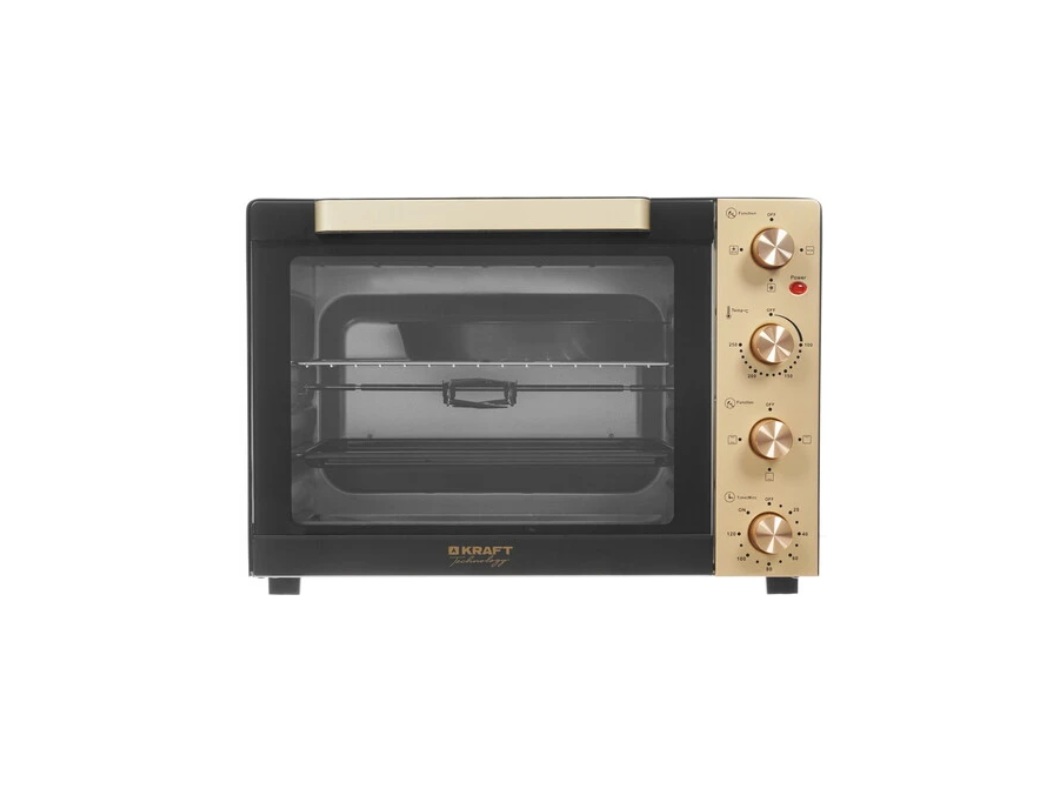 Электропечь KRAFT Technology TCH-MO 6011 RKGL обладает вместительной камерой на 60 л и 6 режимами нагрева, с помощью которых можно готовить выпечку, пиццу, мясо на гриле и другие блюда. С помощью таймера можно устанавливать определенное время приготовления до 120 минут. По завершению времени прибор отключается и срабатывает звуковое оповещение. Управление доступными параметрами осуществляется за счет поворотных переключателей.
