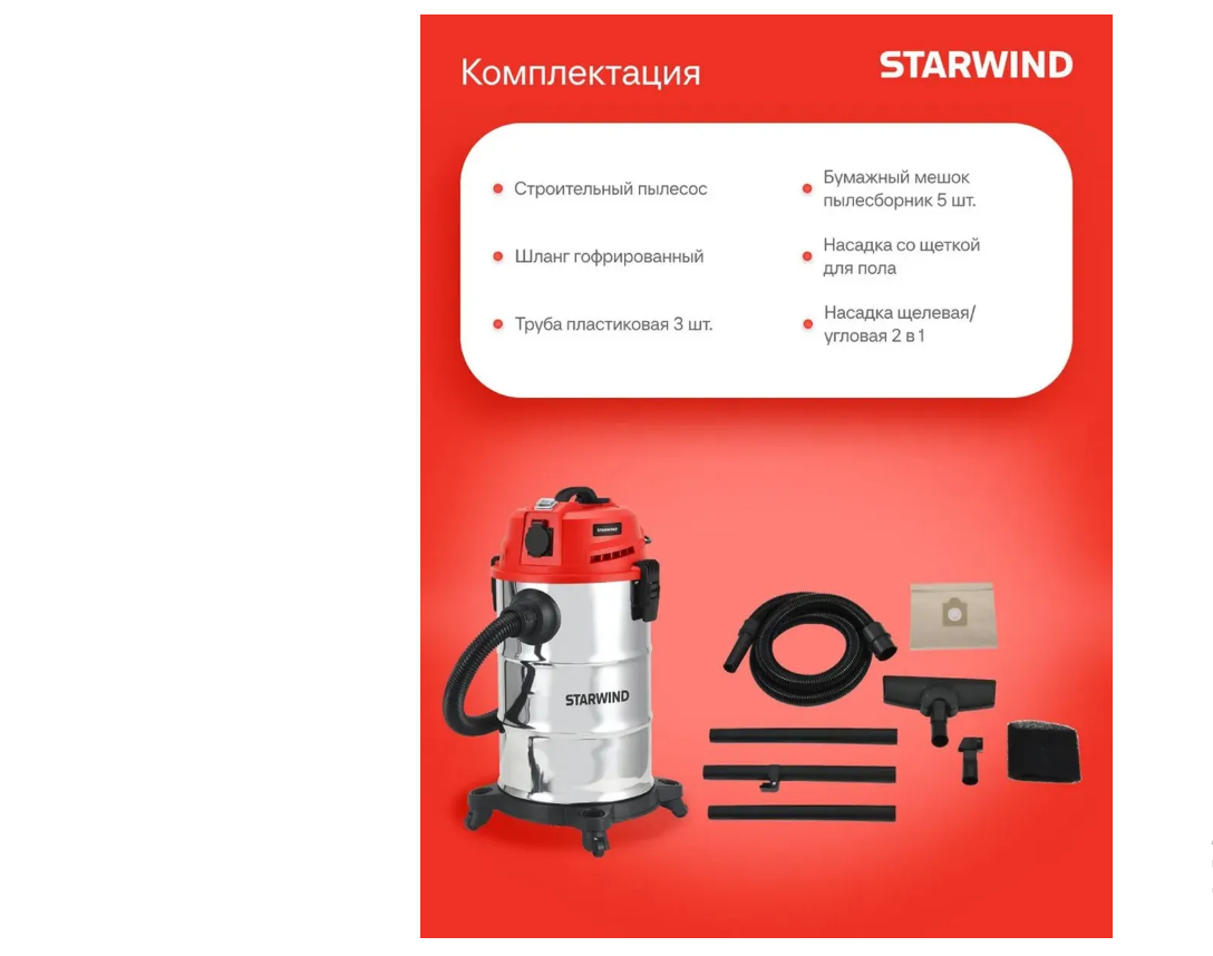 Шланг гофрированный; труба пластиковая 3 шт.; бумажный мешок пылесборник; насадка со щеткой для пола; бумажный мешок пылесборник 5 шт.; насадка щелевая/угловая 2 в 1; строительный пылесос