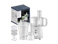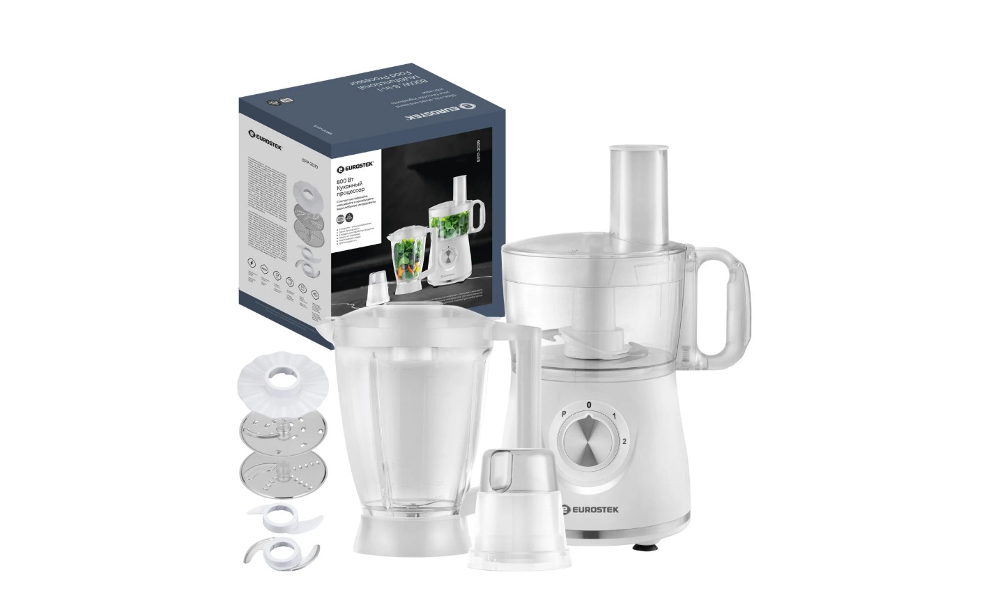 Максимальная мощность 800Вт; 2 скорости + режим "Pulse"; измельчитель 1.2л., блендер 1.75л., кофемолка 70гр, овощерезка, диск для шинковки, диск для картофеля фри, универсальный нож, эмульсионный диск для соусов и майонеза. Защитный замок. Стальной нержавеющий нож для измельчения. Электропитание 220-240 В., 50 Гц.