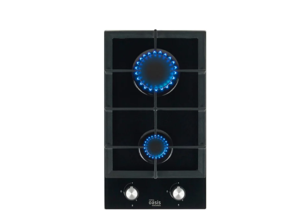 газовая на 2 конфорки, закаленное стекло, мощность: 3800 Вт, автоматический электроподжиг, газ-контроль, решетки: чугун, независимая установка, размеры (ШхГ): 29x51 см