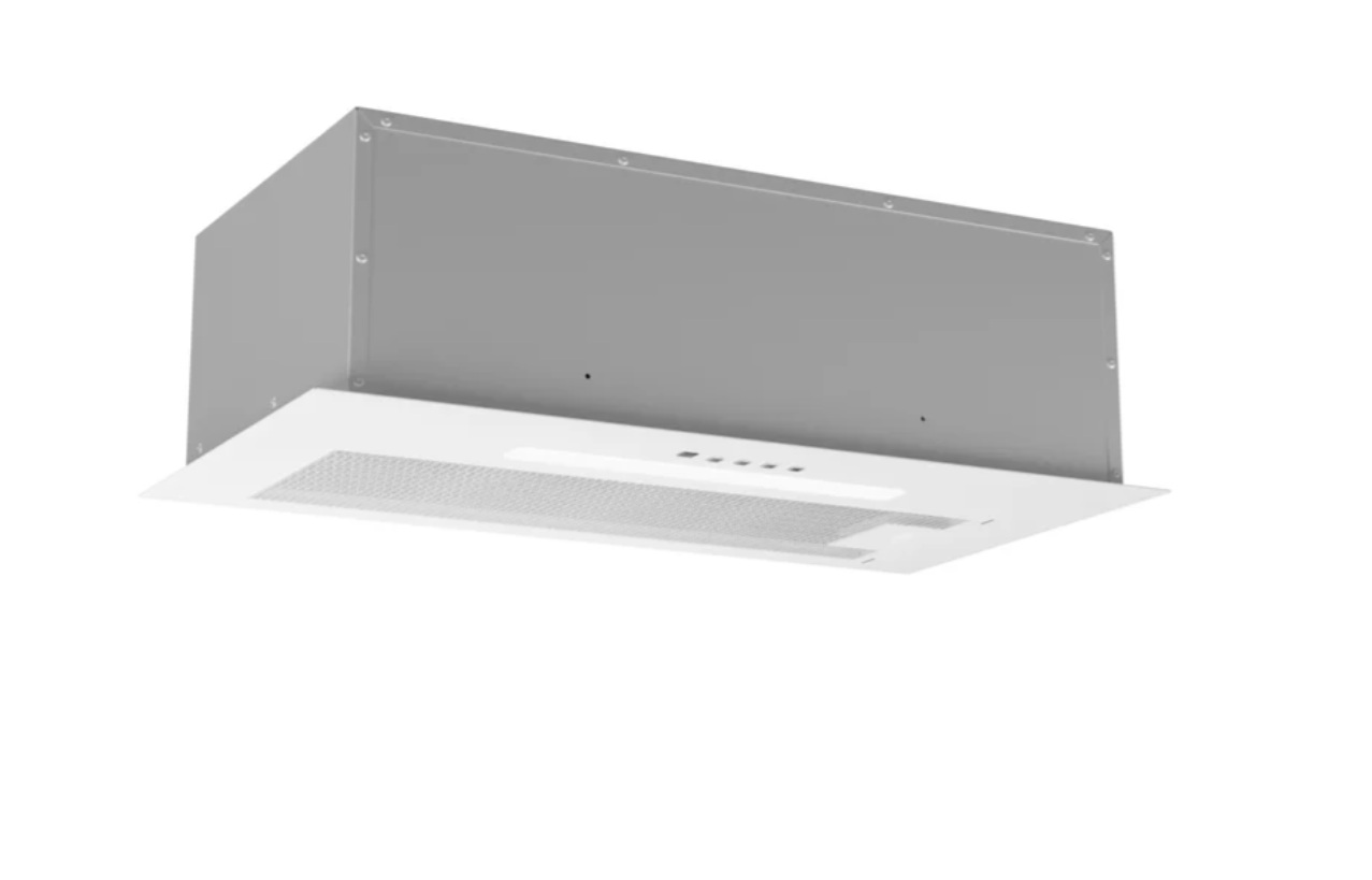 конструкция скрытая, монтаж для встраивания, ширина 53 см, управление электронное/кнопочное/жестами, производительность мотора 1080 м³/ч, цвет белый