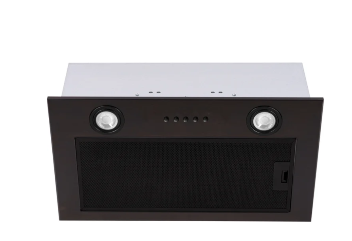 конструкция скрытая, монтаж для встраивания, ширина 52 см, управление механическое/кнопочное, производительность вытяжки 280 м³/ч, производительность мотора 850 м³/ч, цвет черный