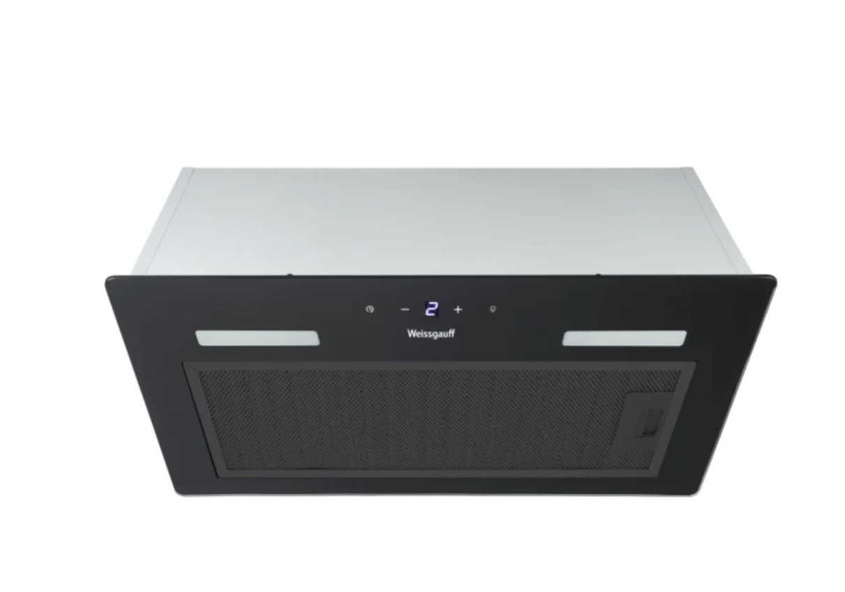 конструкция скрытая, монтаж для встраивания, ширина 52 см, управление сенсорное, производительность мотора 850 м³/ч, цвет черный