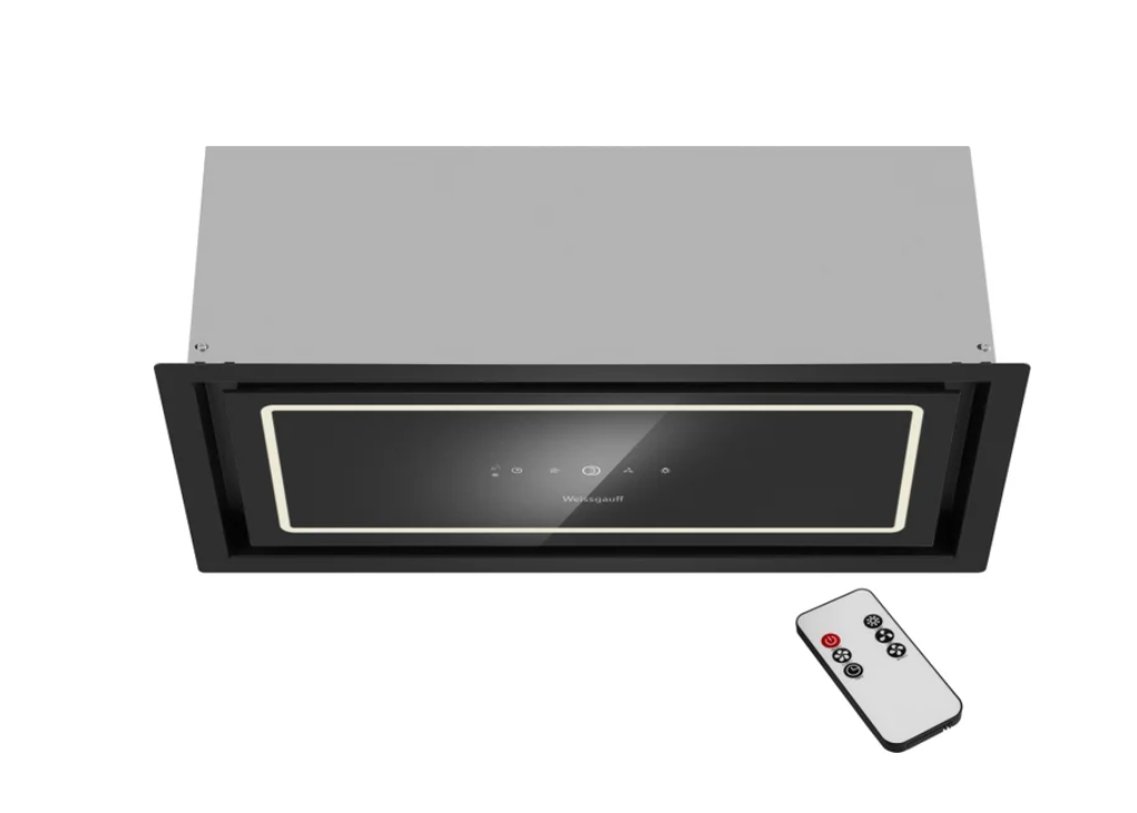 конструкция скрытая, монтаж для встраивания, ширина 60 см, управление сенсорное/дистанционное, производительность мотора 850 м³/ч, цвет черный